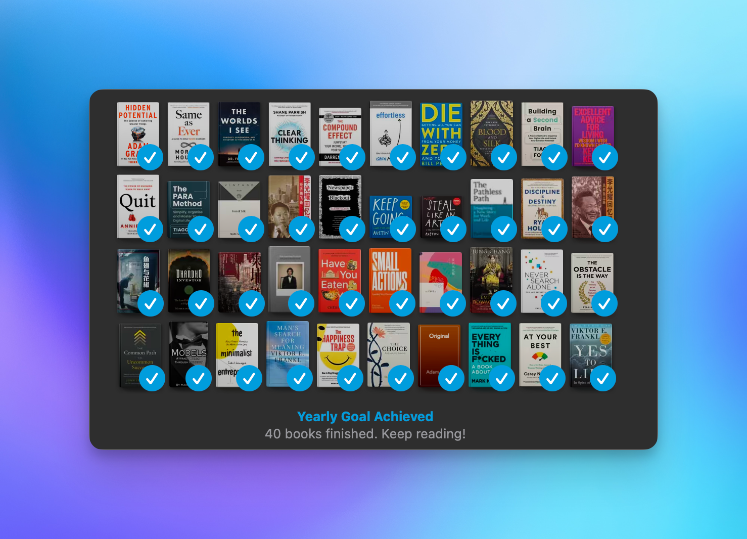 今年年初的时候,制定了一个阅读40本书的小目标,没想到提前一个月完成了。