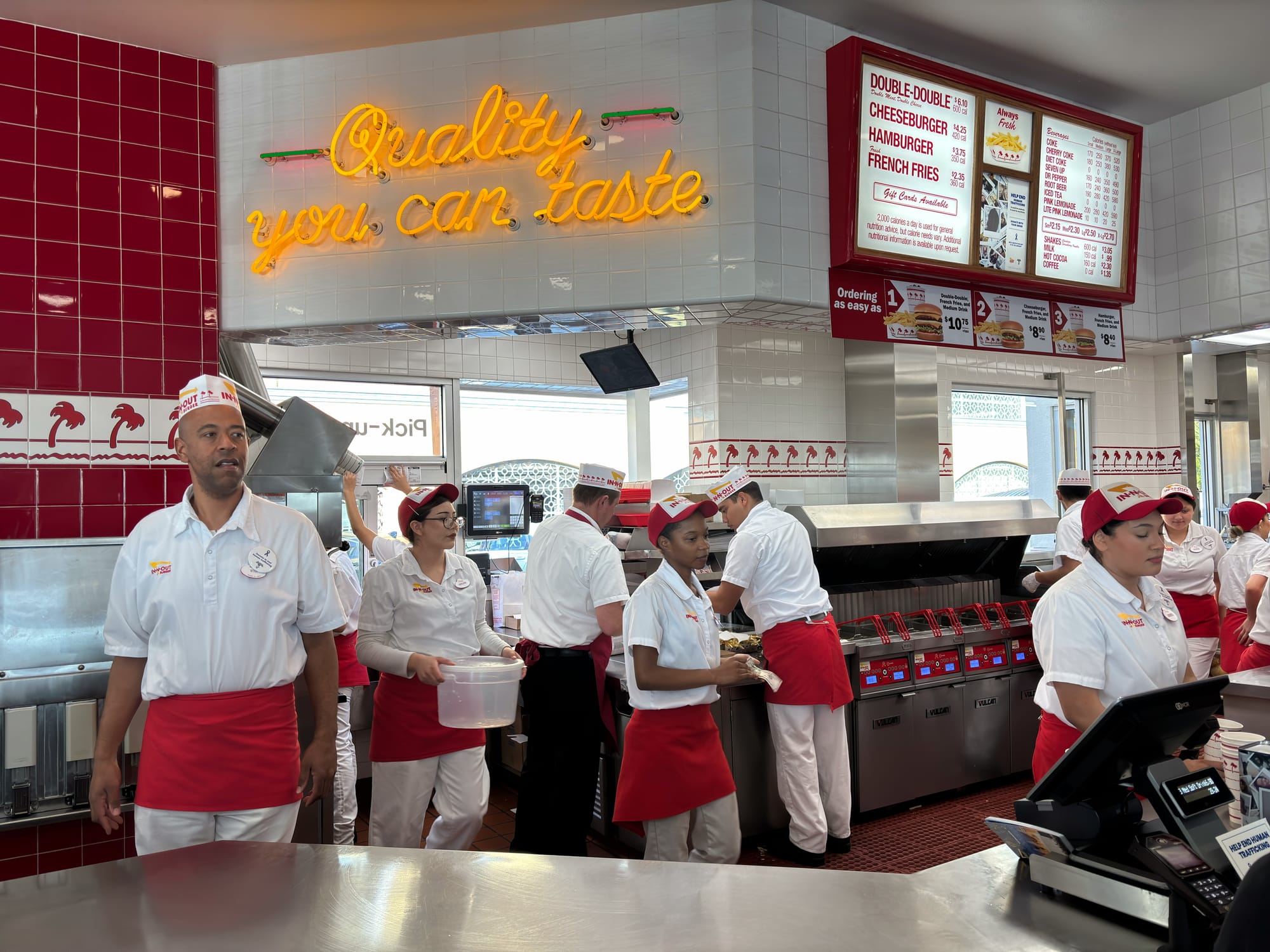 一边时差没倒过来,一边肚子饿得要死。于是决定去吃 in and out。听说来了 LA,必须要试试这个汉堡。到了门店,里面外面塞得满满当当。菜单很简单,和 five guys 差不多,选了一个 double double,一个 hamburger ,再加一杯奶昔,不到$15。总算回到我的预期之内。