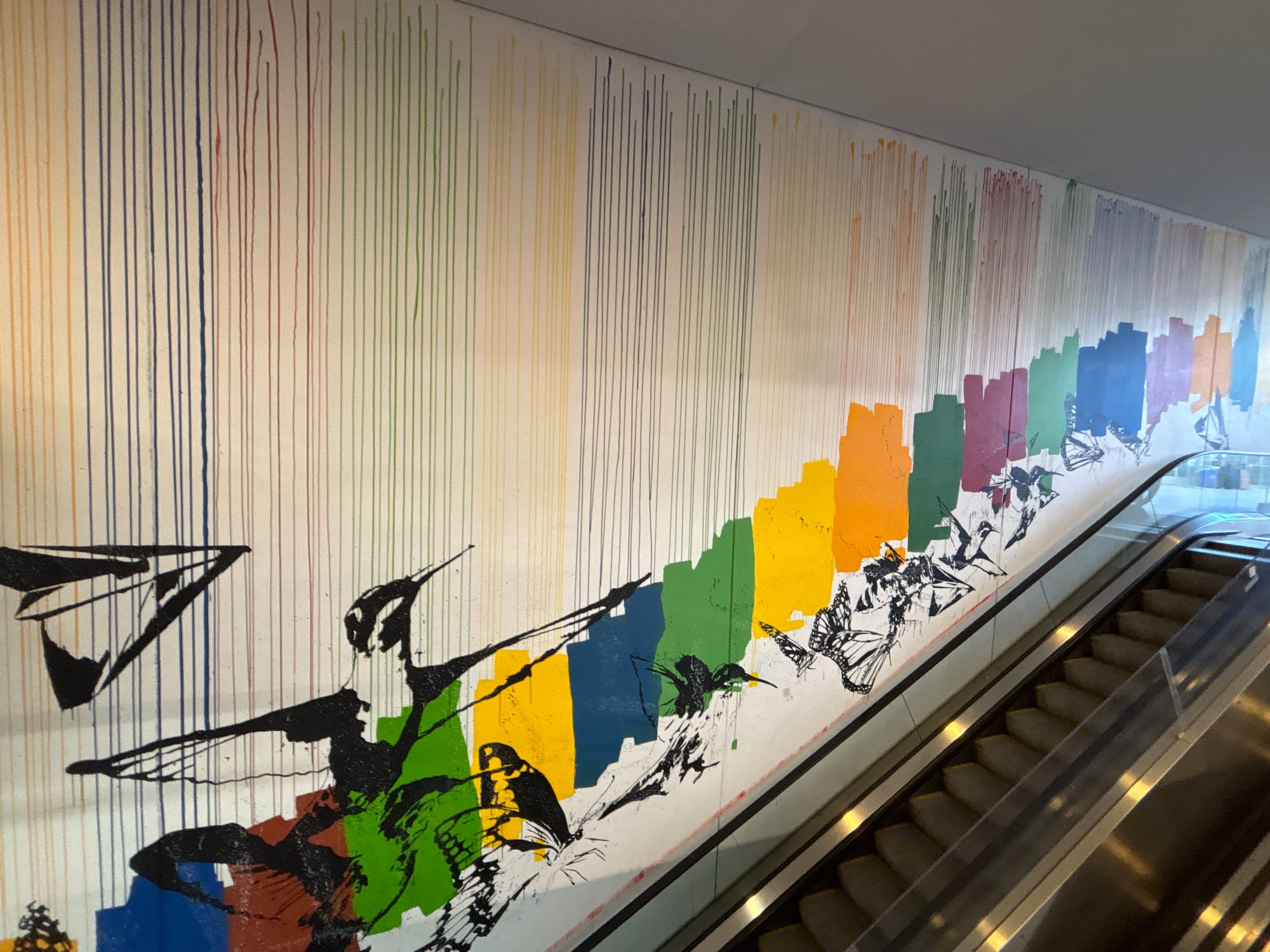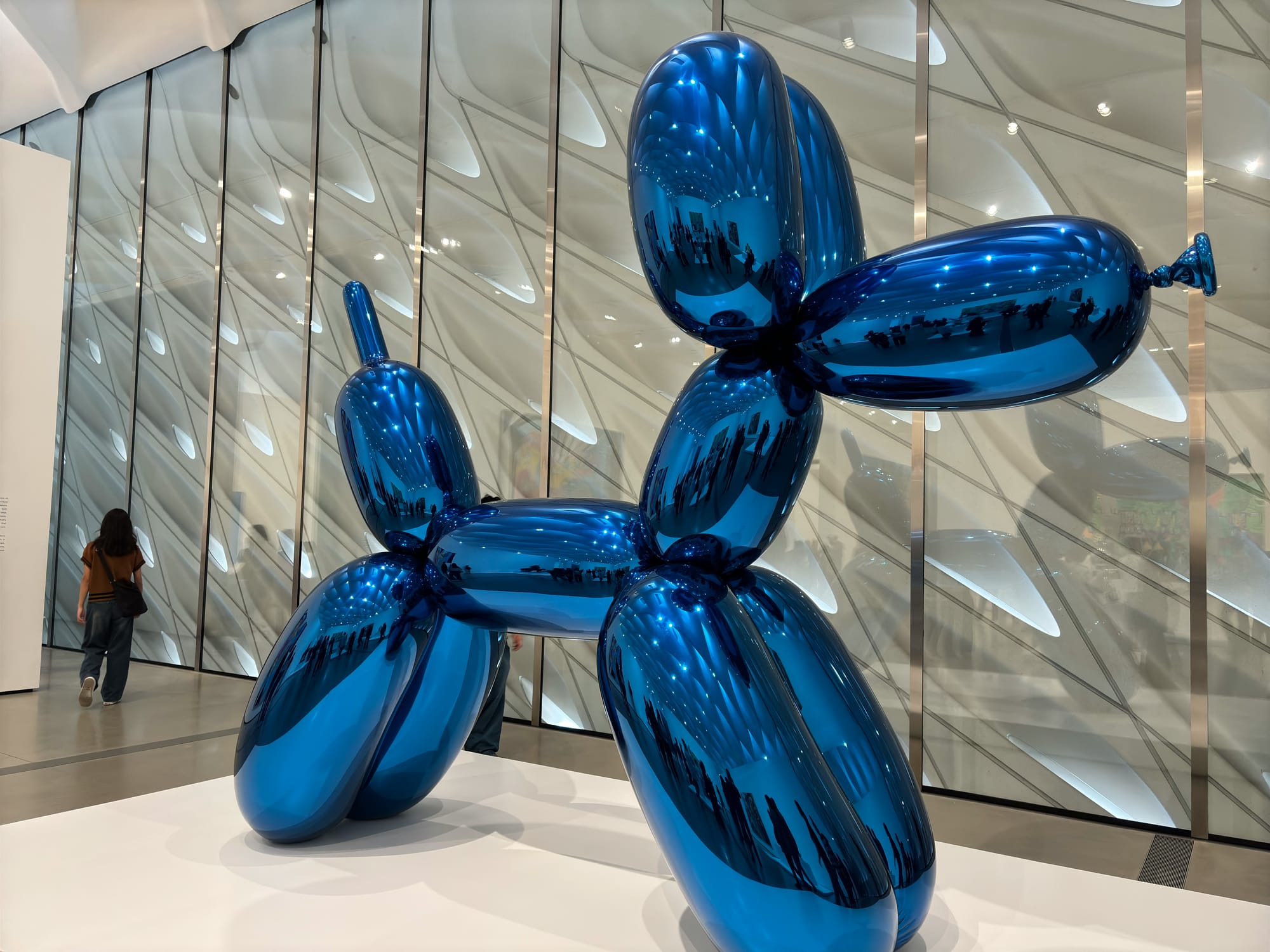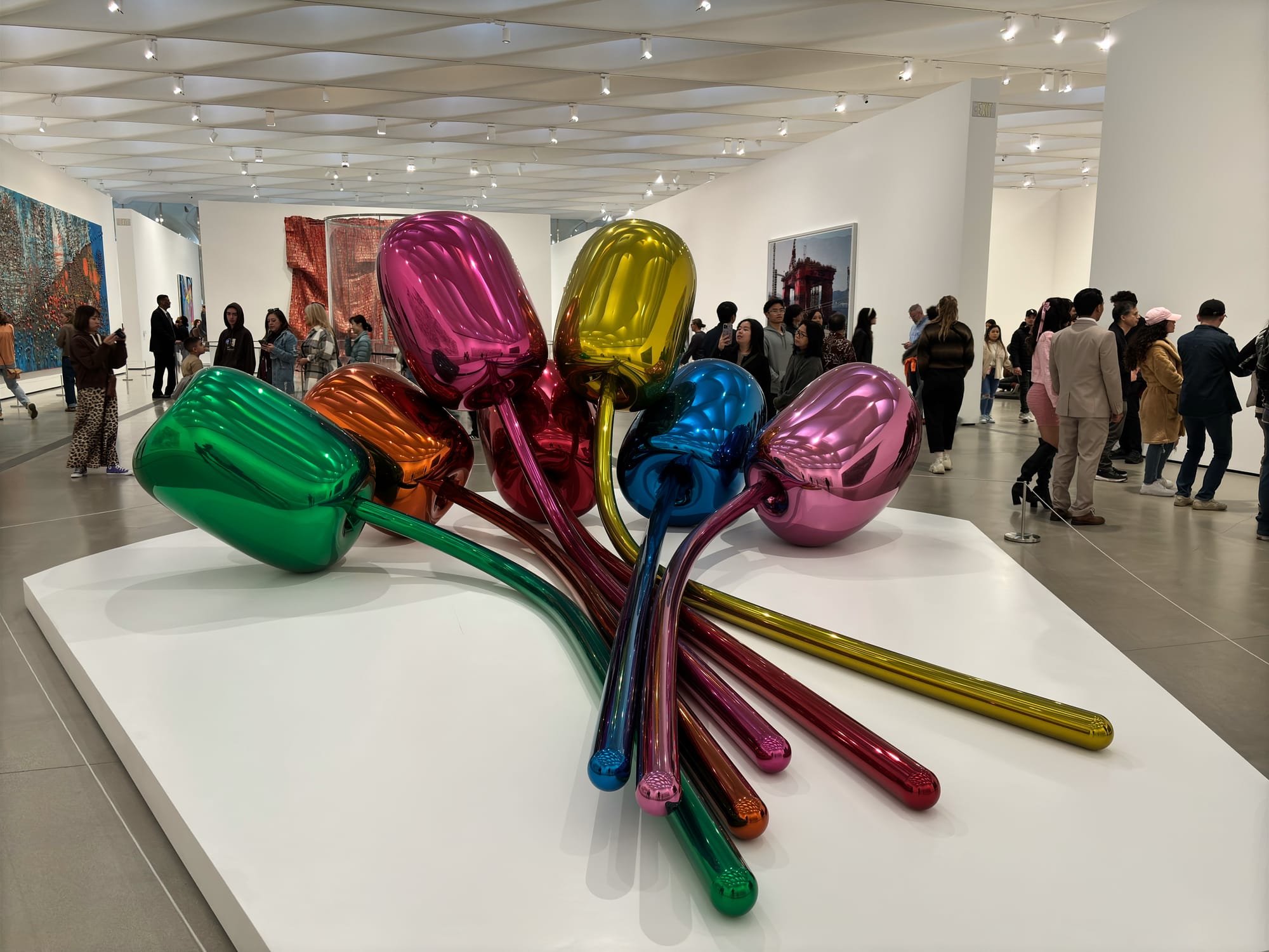 可能因为 The Broad免费,也可能因为里面都是当代艺术,人非常多。这里的产品比 LACMA 更先锋,更现代。看到有一副安迪 沃霍尔绘制的尼克松像是倒置的,但说明理由没写清楚。于是问旁边的管理员为什么?她也不清楚,帮我找了另一个讲解员。老太太讲了下,大致就是旁边的几幅作品都是讲述莫名其妙的出名,两幅是讲连环杀手,一幅是讲自杀,而尼克松最出名的是水门事件。作者借此反讽尼克松的出名。我说很有意思的是,尼克松可能是在中国最有名的美国总统,因为他重塑了中美关系,所以不同语境下的出名是不一样的。老太太又提了安迪沃霍尔的“毛”,我说我第一次见到是多年前在利兹的博物馆,当时我以为利兹这么厉害,居然买了这么贵的作品,后来才知道,这其实是一个系列,有很多幅。