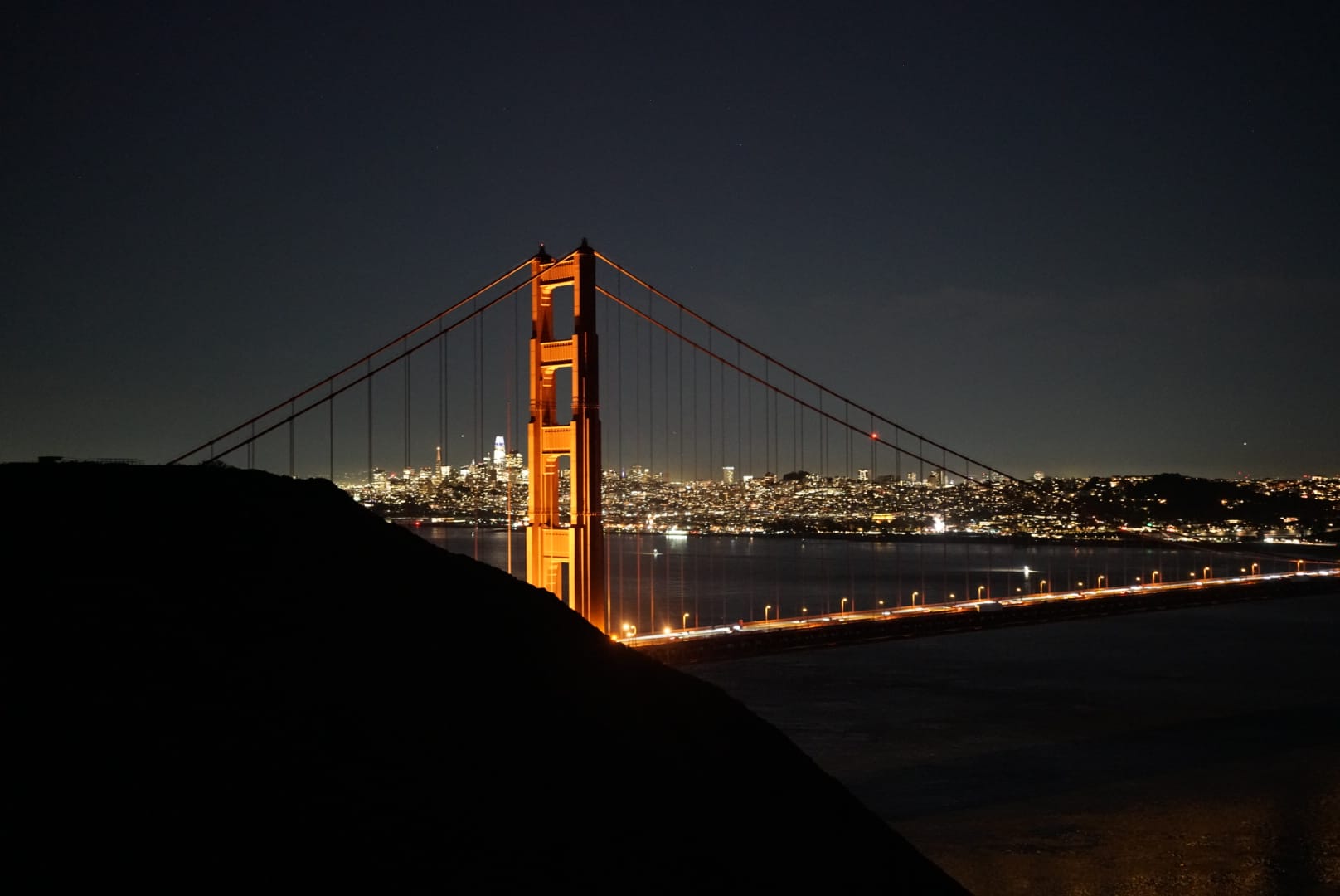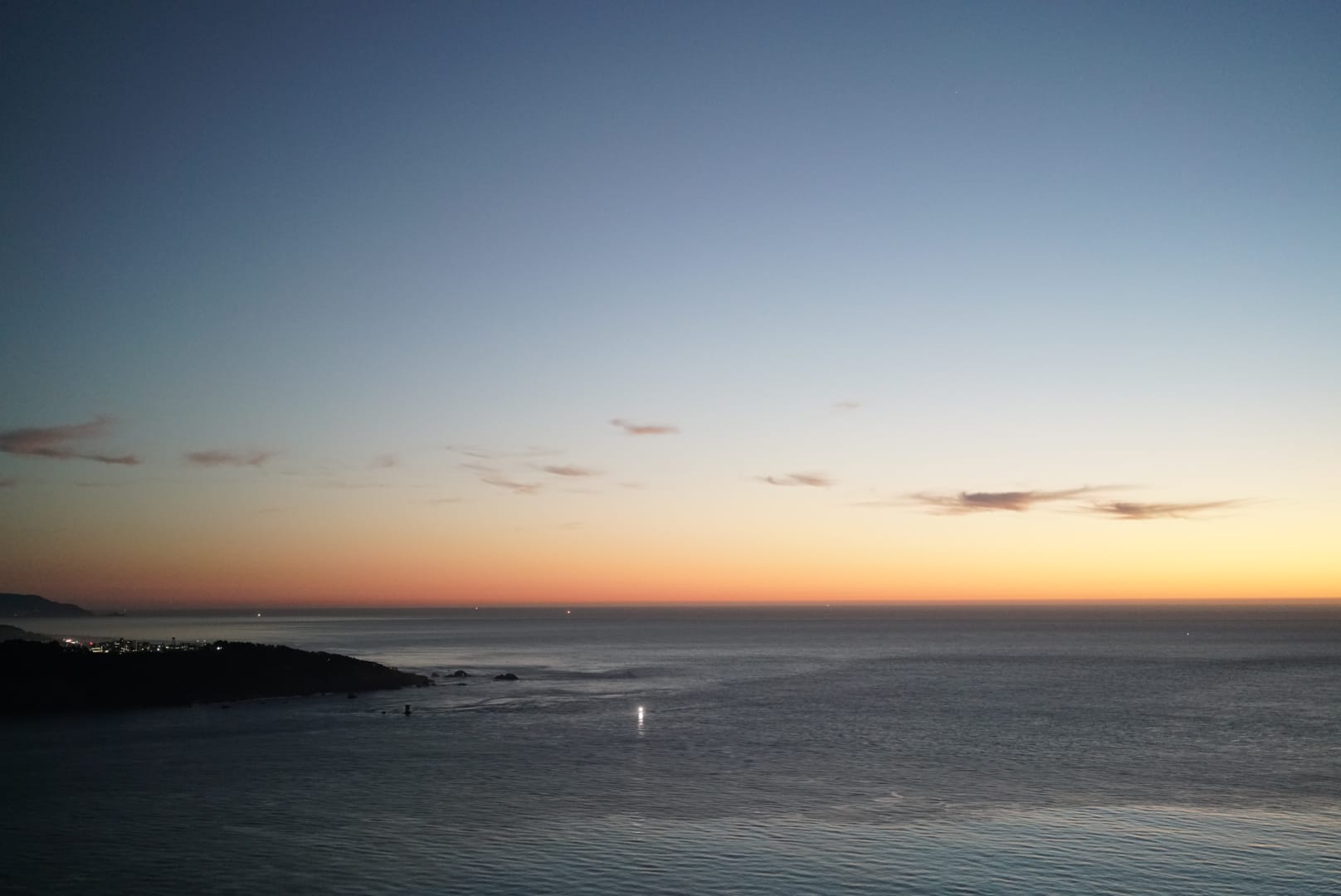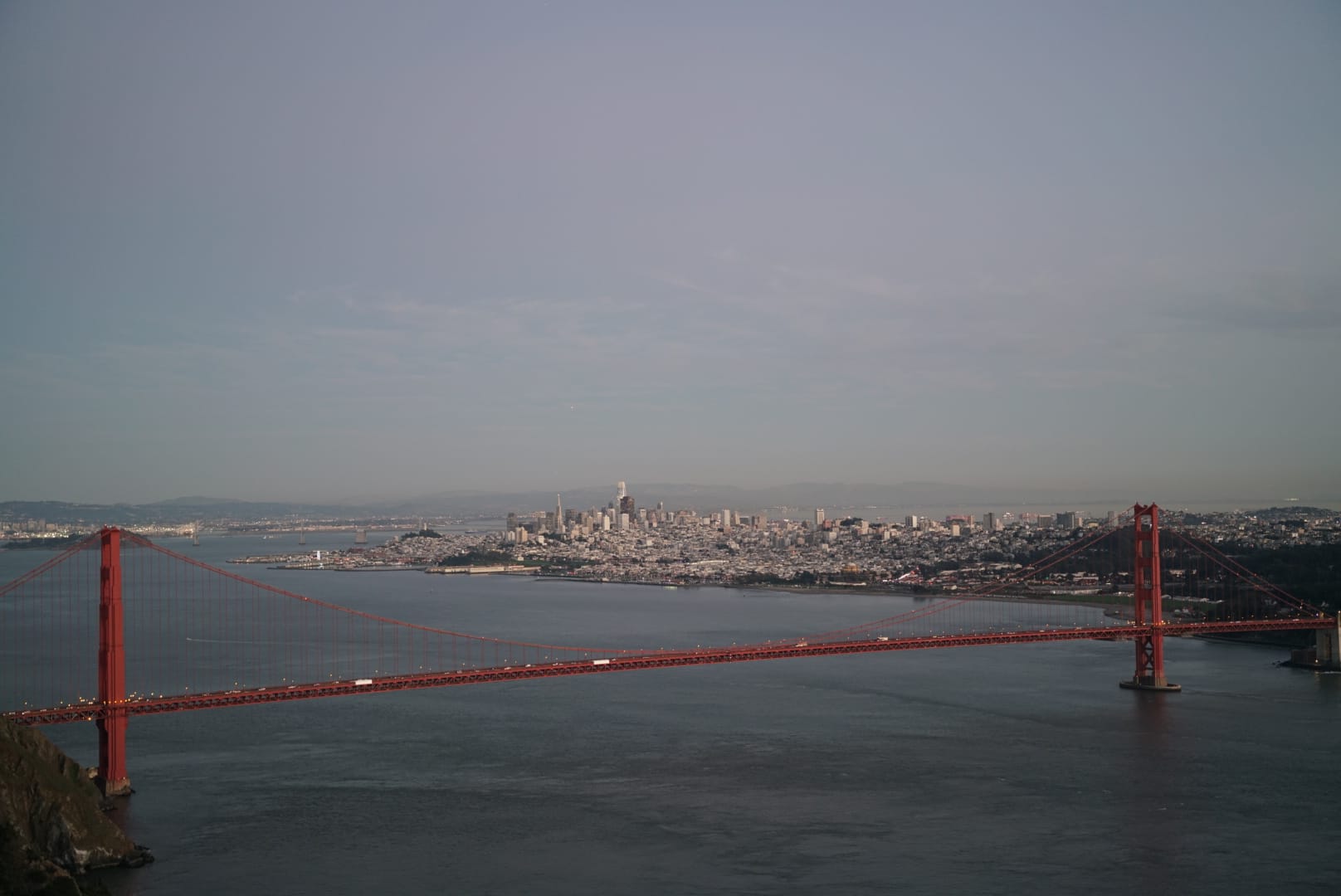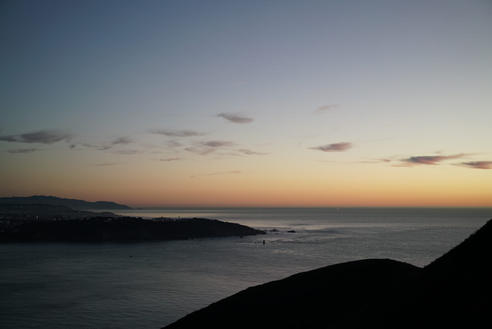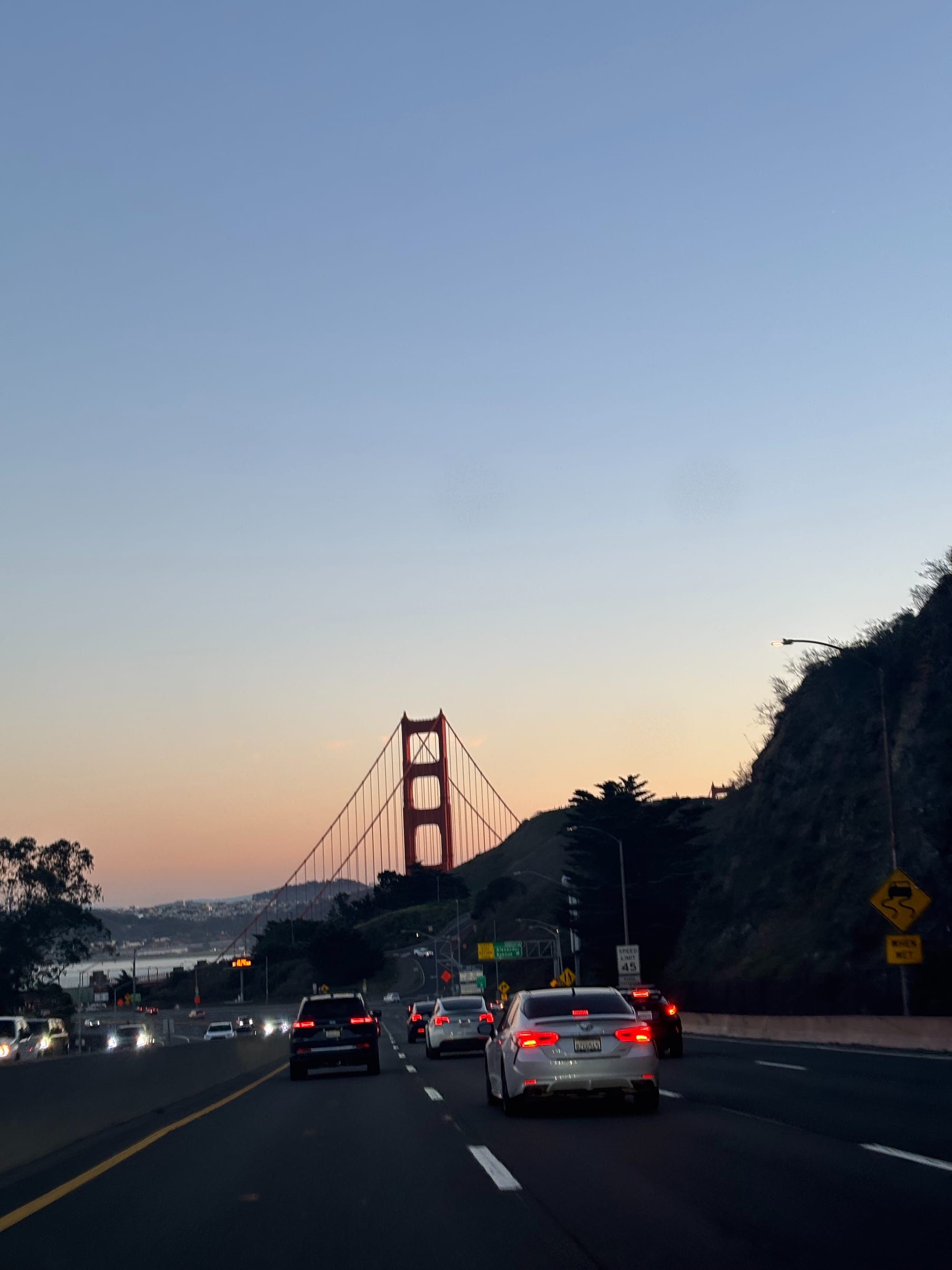 到了三番之后,时间尚早,朋友说我们去金门大桥看日落吧。于是在城里绕了一大圈,往桥上开去。没想到上桥前比较堵,我们在桥上没看到完整的日落,只看到太平洋的余晖,也非常震撼。整个海面一片金黄,极其安逸。