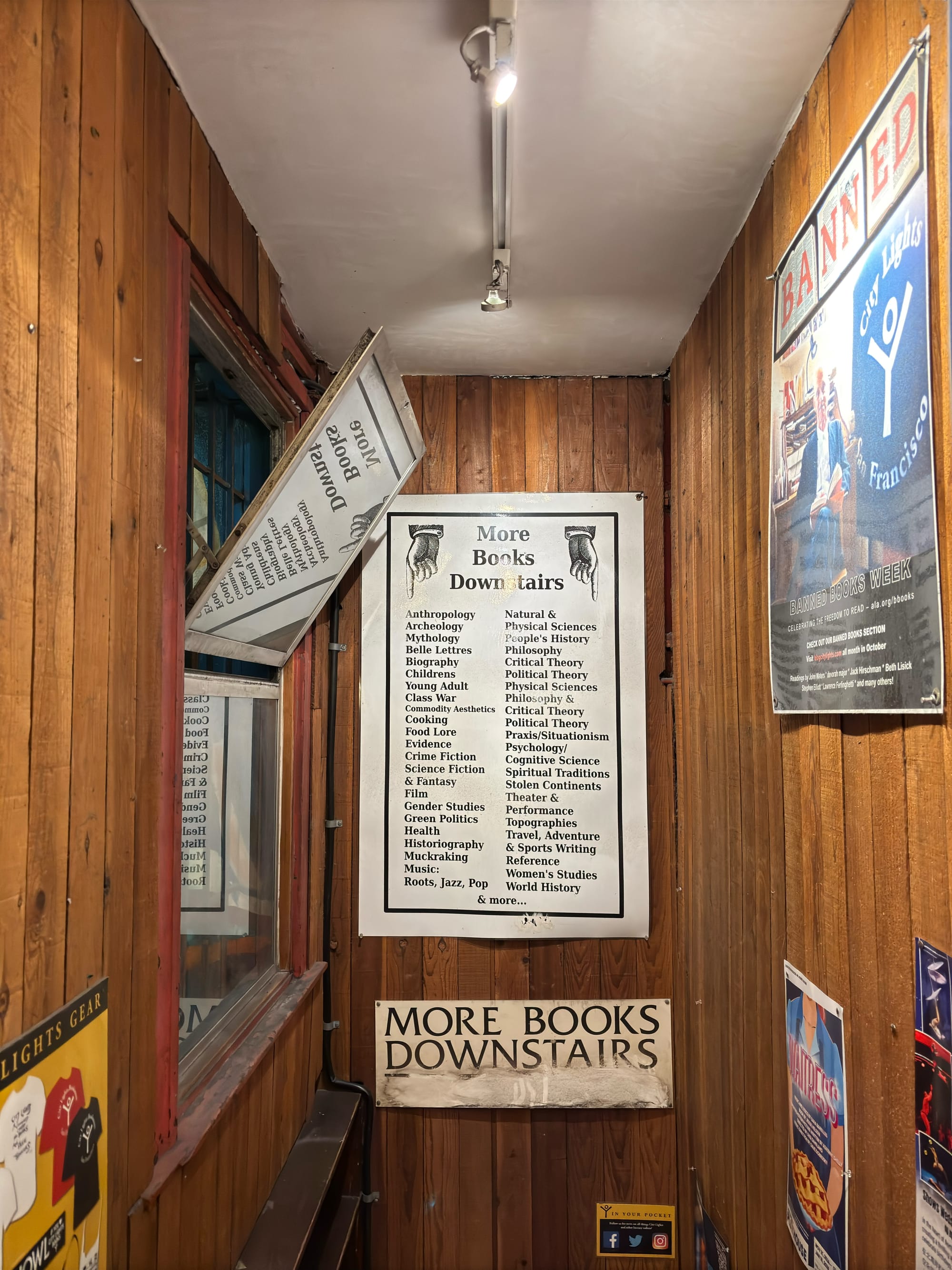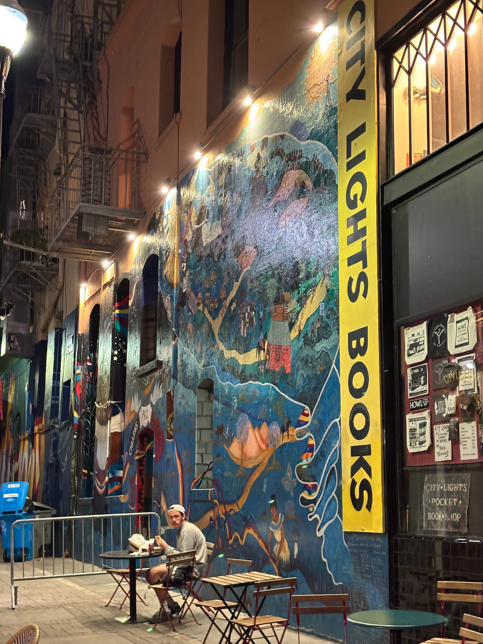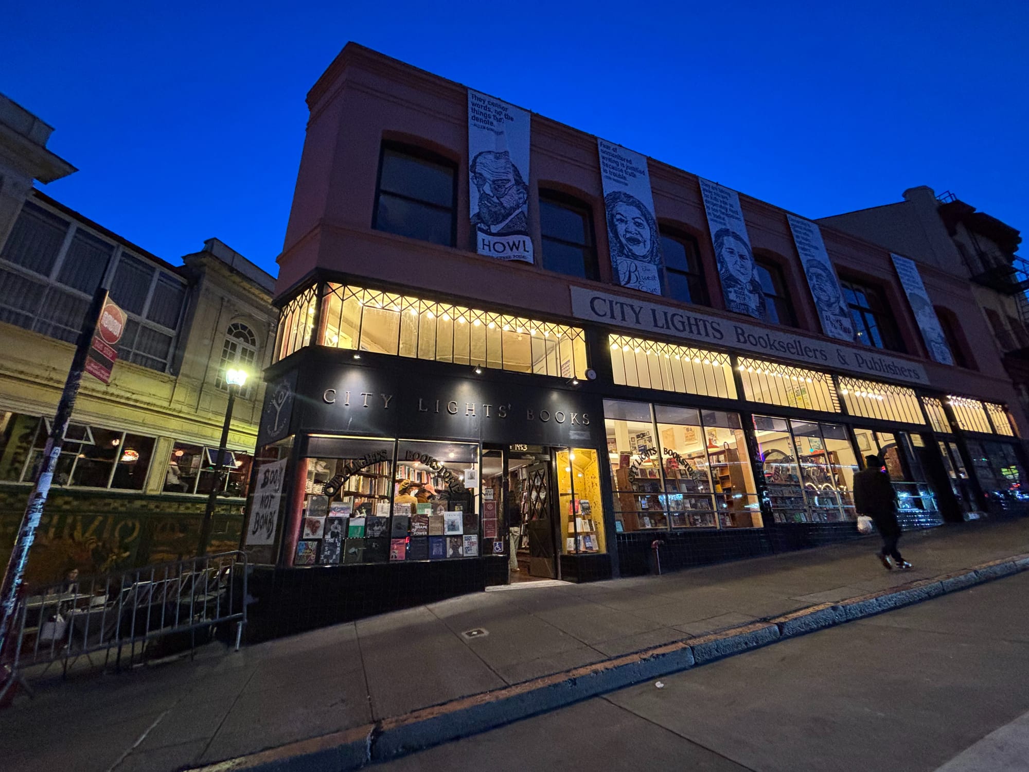 聚餐完,在附近转了转,本来想去格外书店转转,就是那个一群湾区朋友集资开的中文书店。非常有个性,连门口的广告牌都是之前店家的,只不过把一些文字涂抹掉了。据说营业时间也很有个性,果然我们扑了个空。恰好 City Lights 也在附近,我们就去那逛了逛,毕竟这是嬉皮士的发源地。